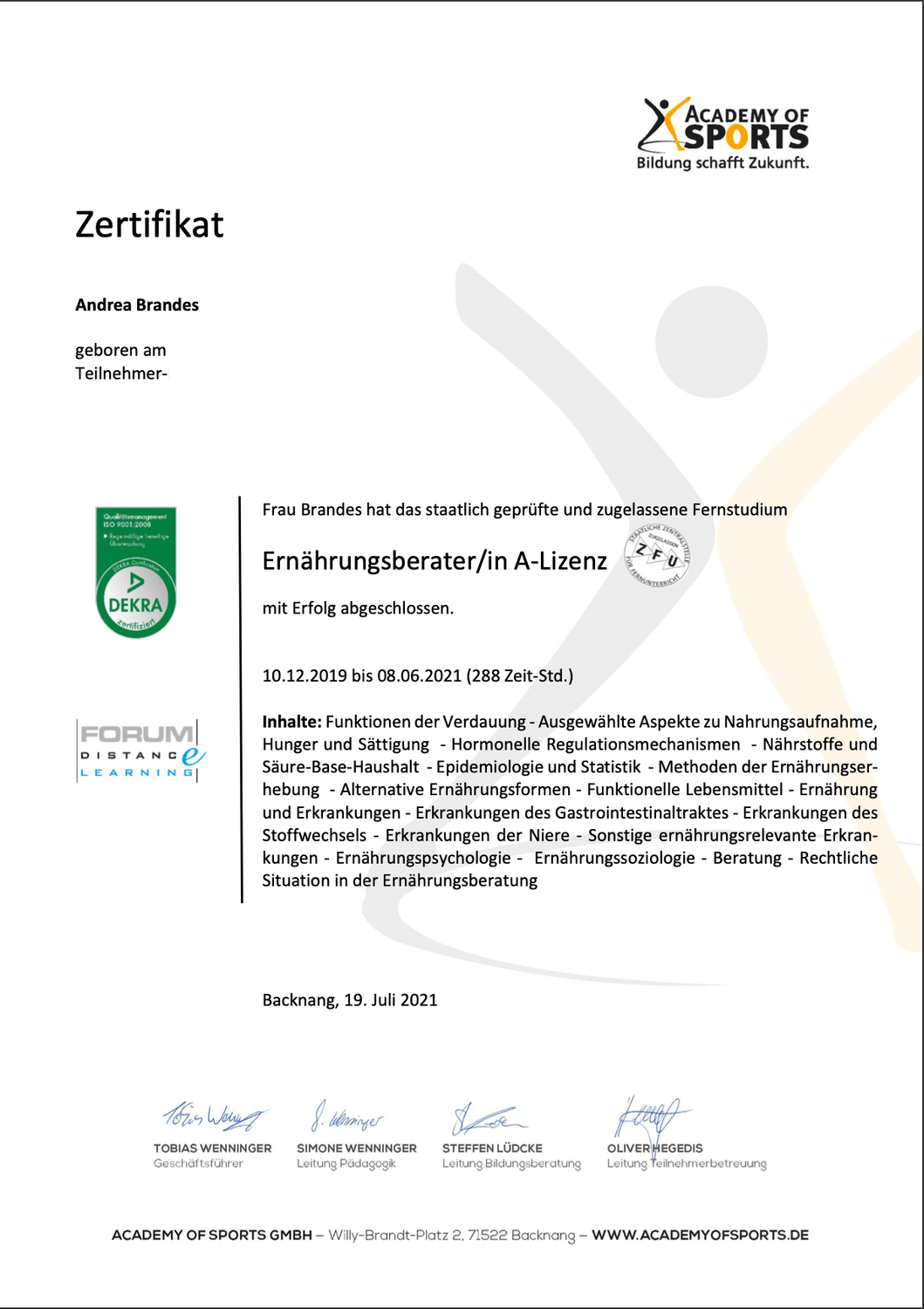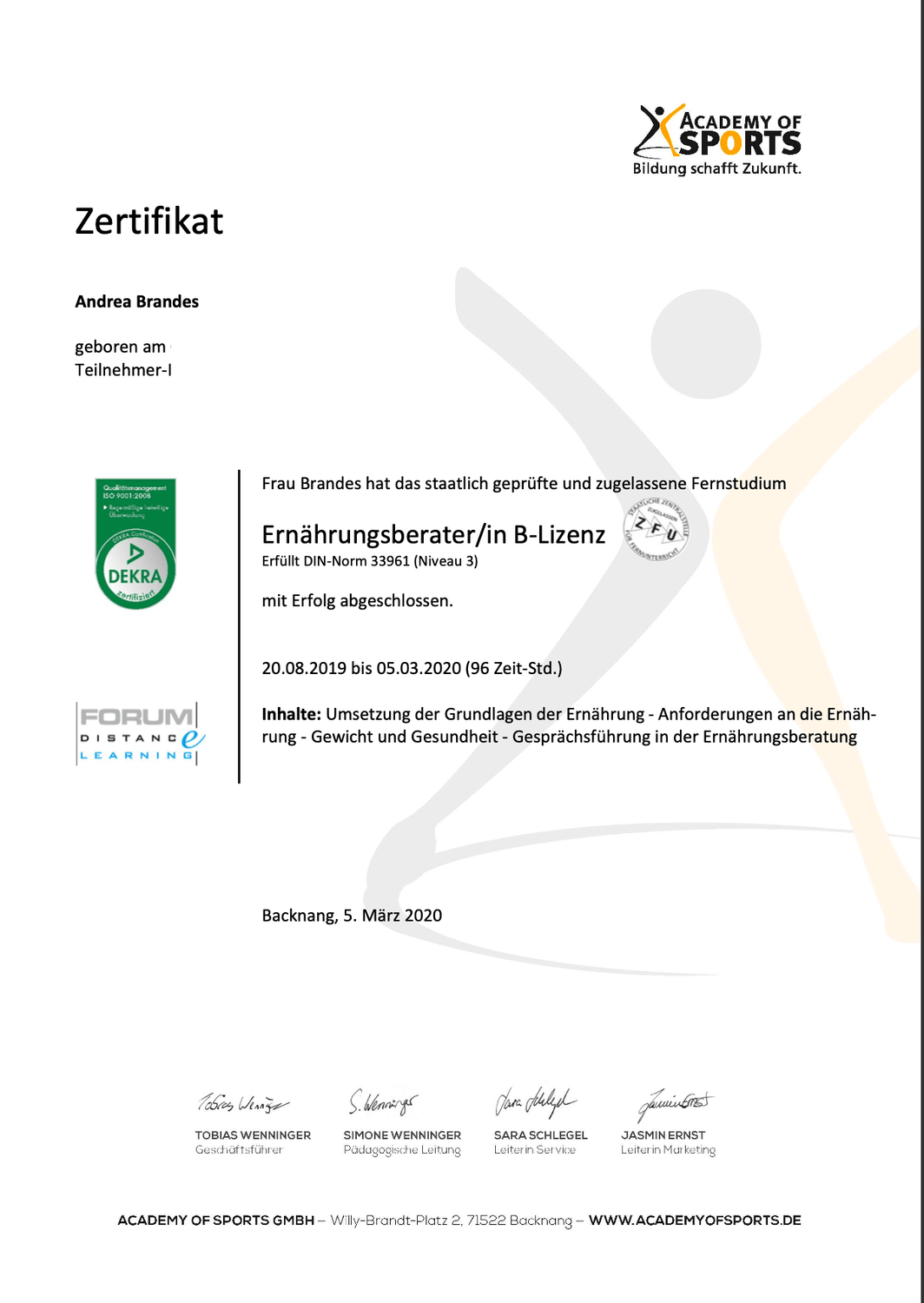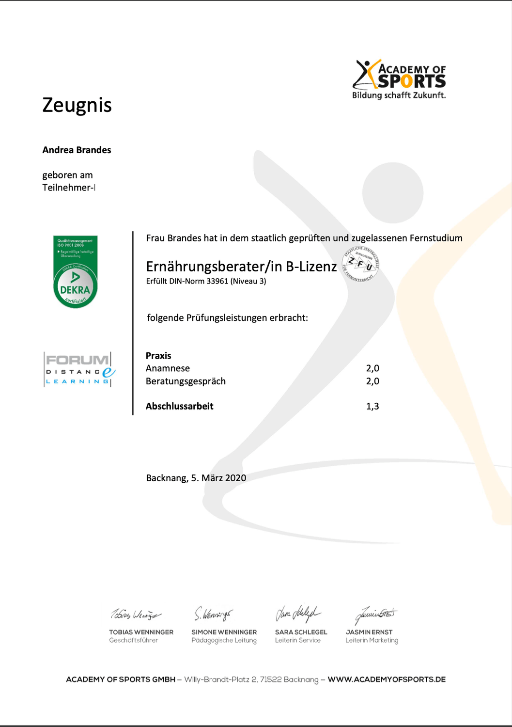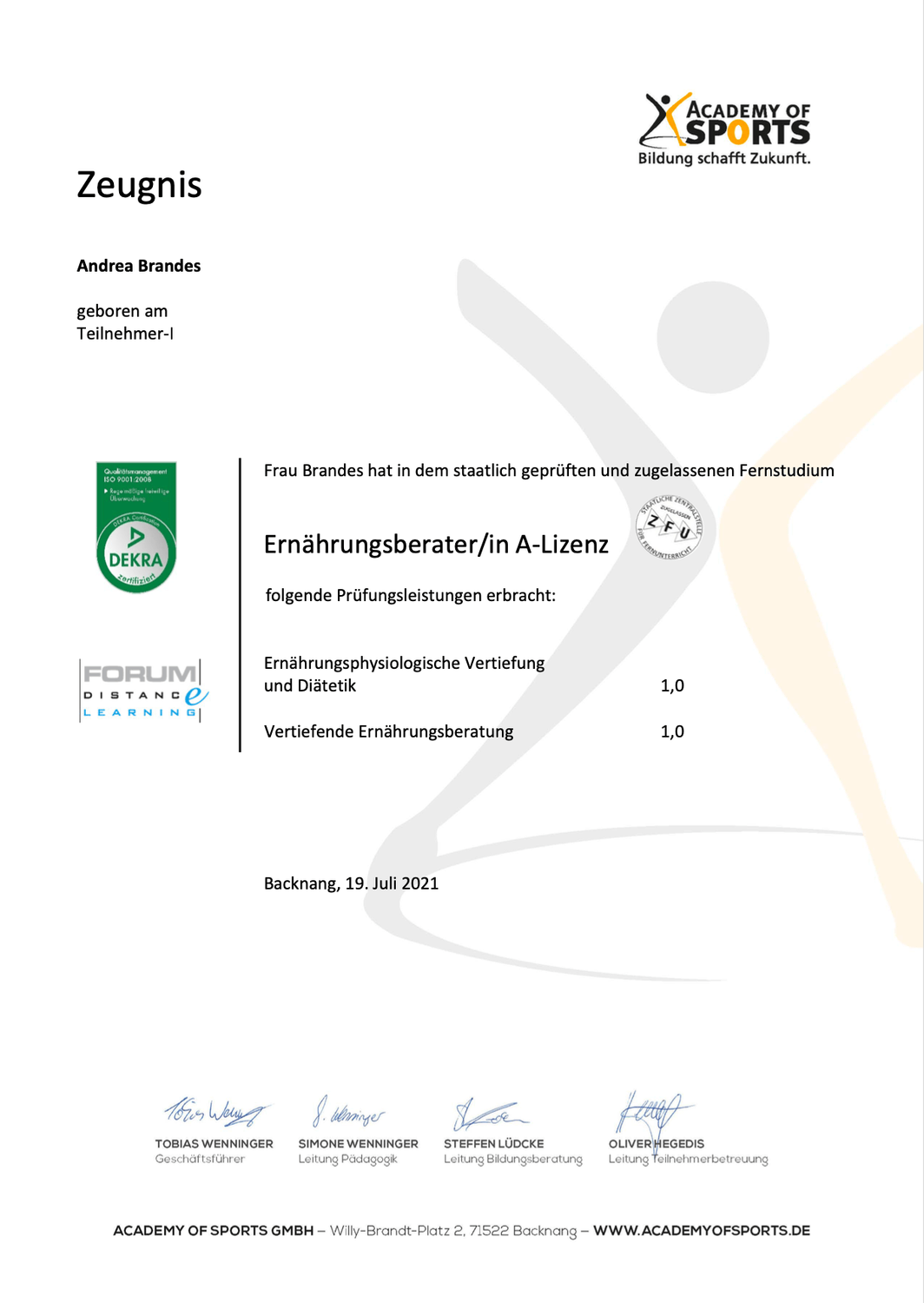 ![]() Andrea Brandes Ernährungsberater A Lizenz | ![]() Ernährungsberater A Lizenz Zertifikat | ![]() Ernährungsberater B Lizenz | ![]() Ernährungsberater B Lizenz Zertifikat | ![]() Ernährungsberater C Lizenz | ![]() Ernährungsberater vegetarische Ernährung | ![]() Ernährungsberater für Schwangere | ![]() Ernährungsberater Babys und Kleinkinder Zertifikat | ![]() Ernährungsberater Babys und Kleinkinder |